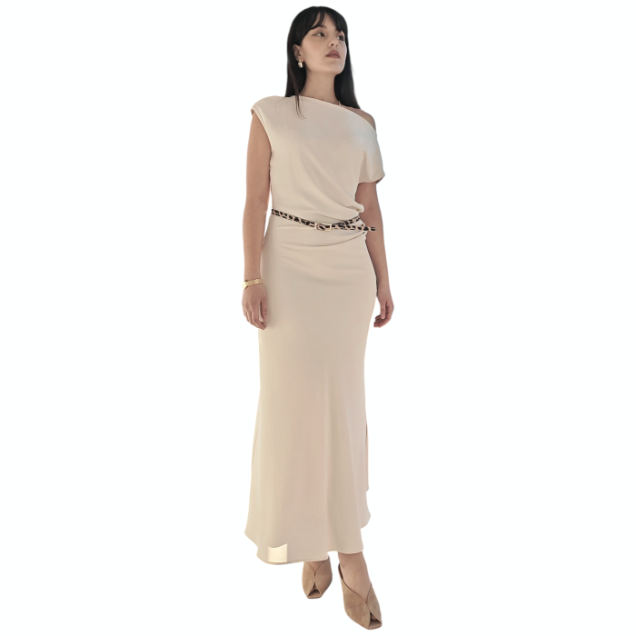 Abito donna IMPERIAL lungo scollo a barca e a V dietro drappeggio cintura animalier (M - Zinco)