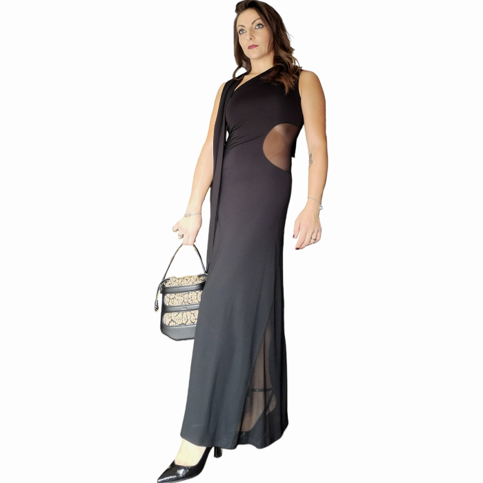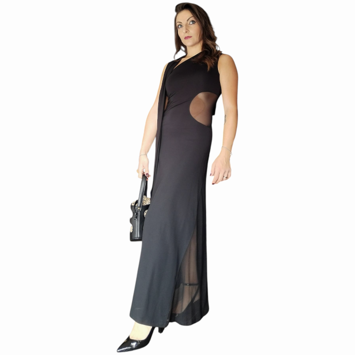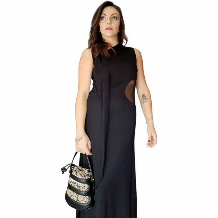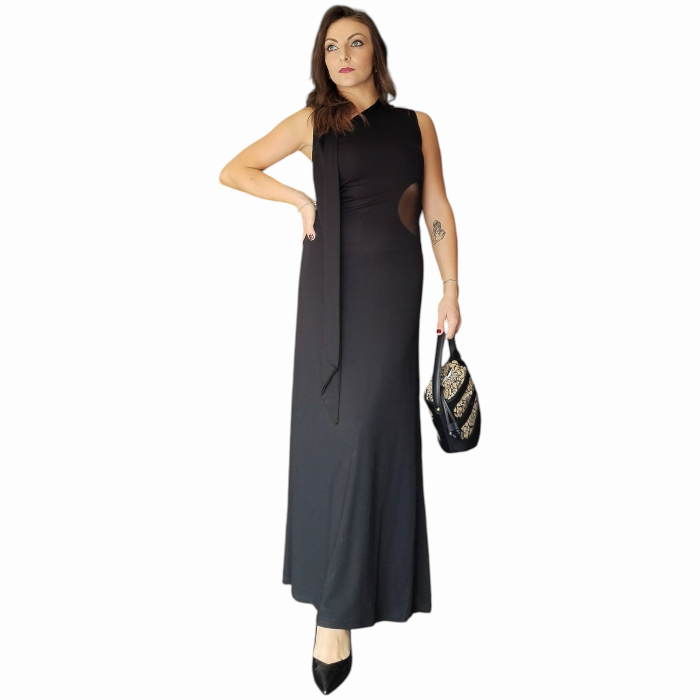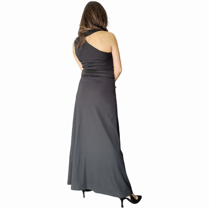 Abito donna IMPERIAL lungo con collo asimmetrico e velature su fianco e base (S - Nero)