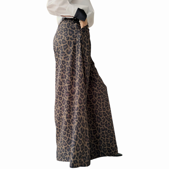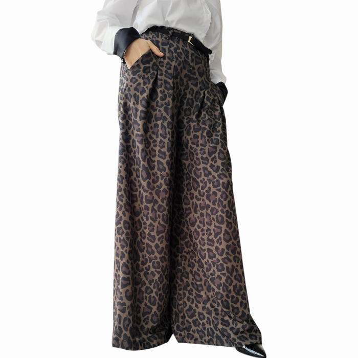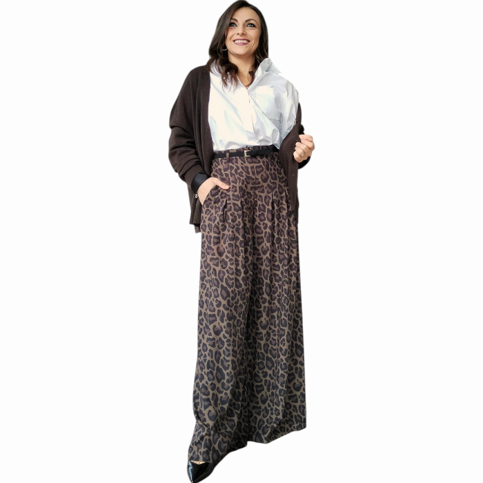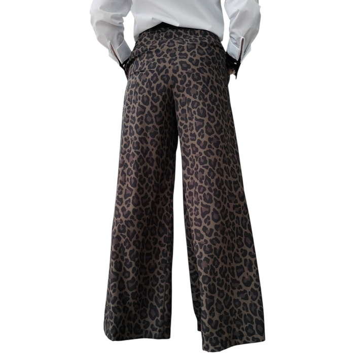 Pantalone donna IMPERIAL gamba ampia vita alta stampa animalier (M - Fango/Nero)