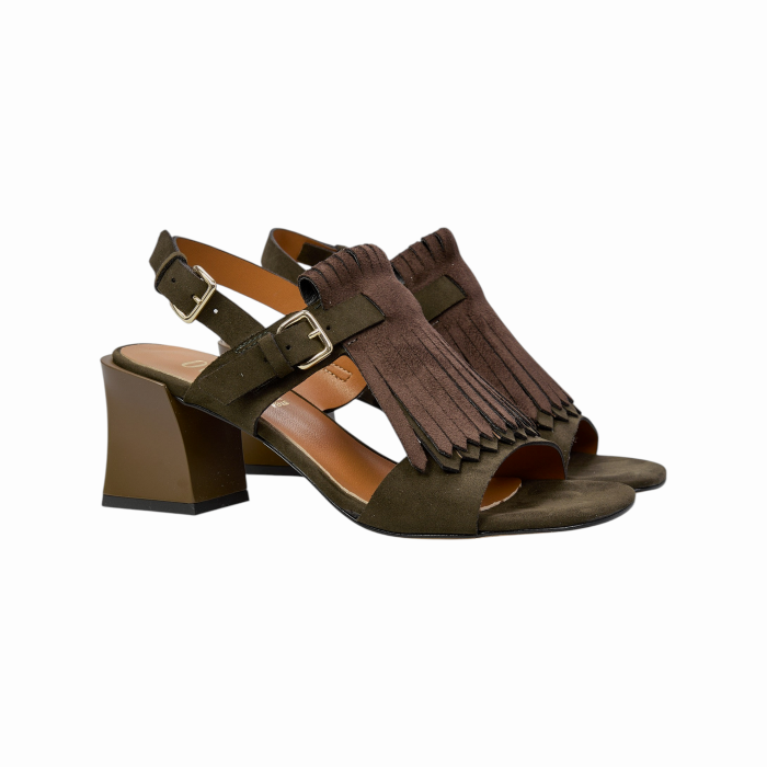 Scarpa donna OVYE' sandalo in camoscio con frange e tacco largo alto 5 cm