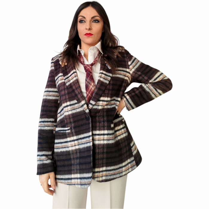 Giacca donna SUSY MIX blazer monopetto fantasia Check con spille e tasche a filetto