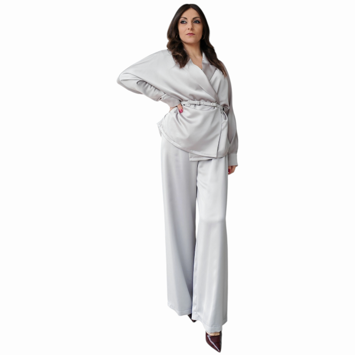 Tailleur donna IMPERIAL effetto raso blazer doppiopetto con cintura pantalone gamba ampia